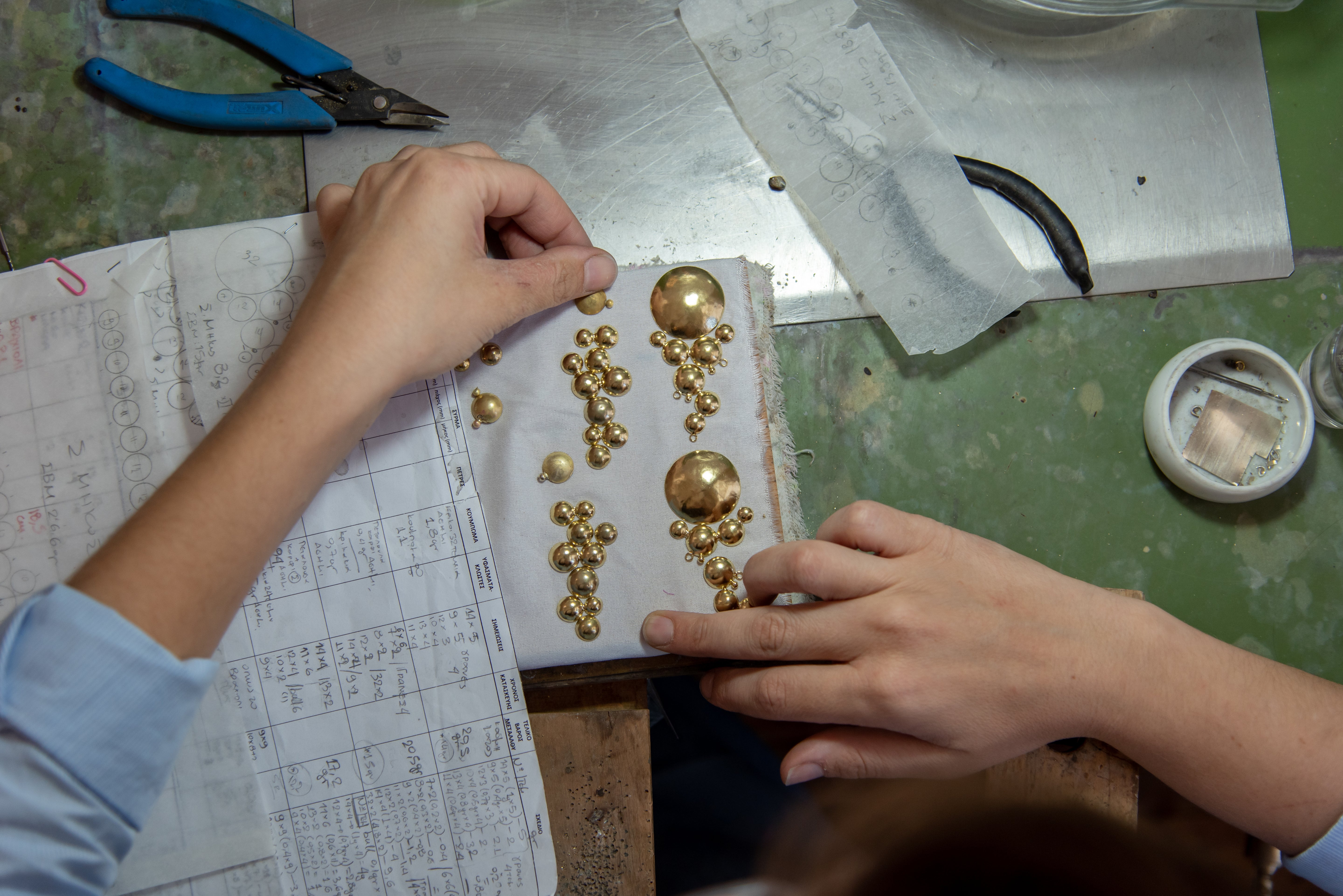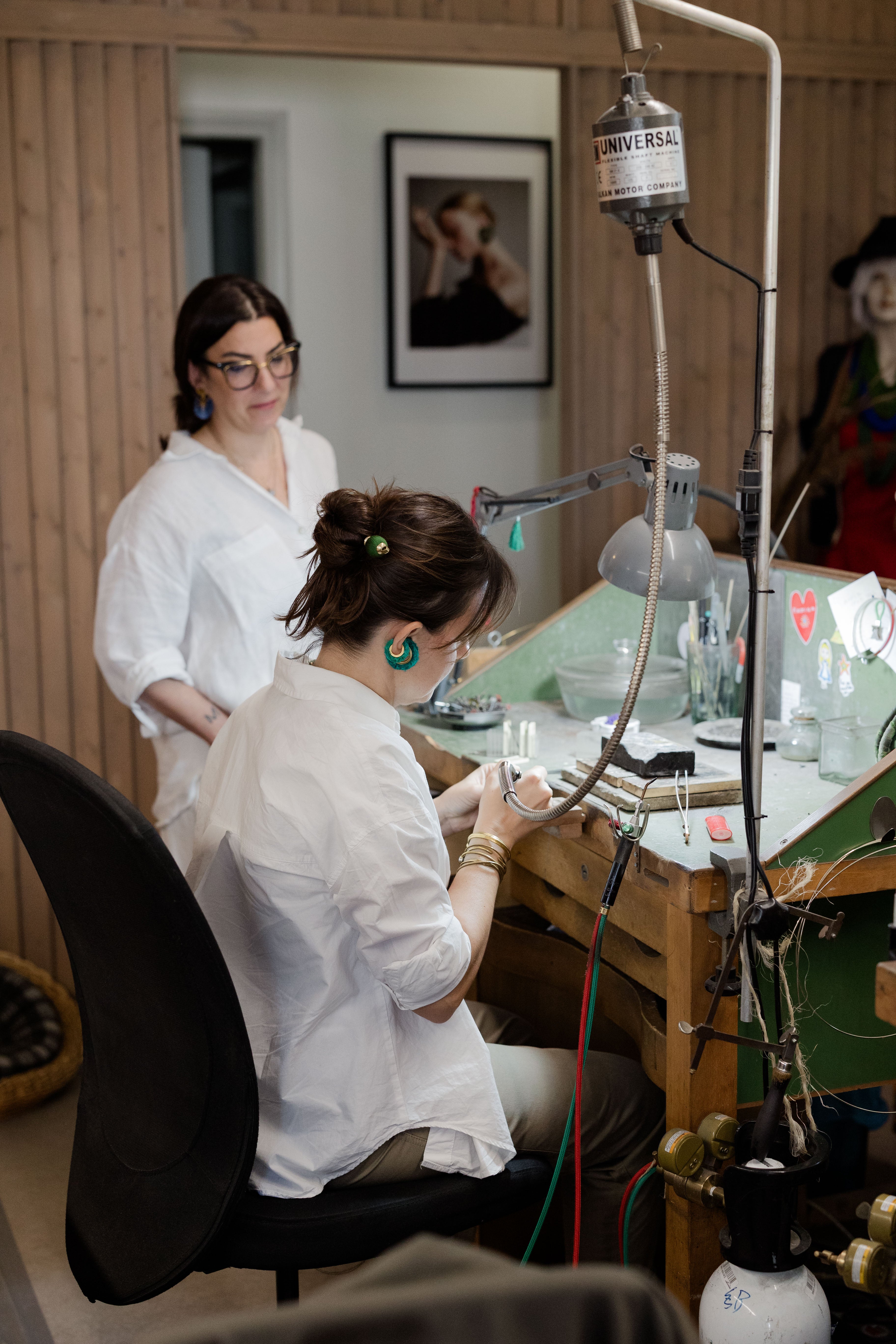 Katerina's signature style is theatrical and bold, marked by clean lines and contrasting colour combinations. What sets the KM brand apart is not only its unique design language, but also its fully handmade production process, carried out in the original Makriyianni workshop in Chania. Katerina leads a talented, close-knit team she has personally trained, fostering a collaborative, family-like atmosphere. Together, they bring to life collections that blend contemporary design with timeless artistry, earning the KM brand international recognition in the world of jewellery.